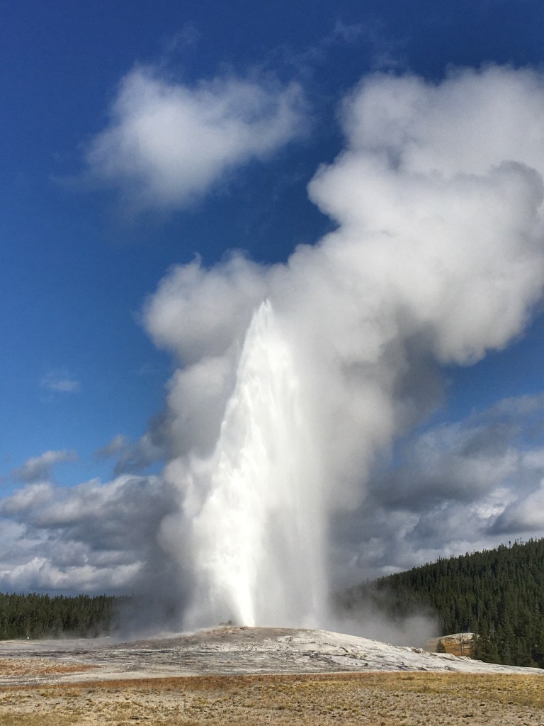 The consistency of Old Faithful is remarkable, you know, thus the name. And it’s really the star of Yellowstone, the main act that keeps bringing the people in decade after decade. Eat your heart out, Wayne Newton (and Homer Simpson)! Approximately every 74 minutes or 20 times a day, yes even in the middle of the night without a single tourist sitting on a bench in the viewing area crowded with people and a few bison, that geyser turbulently ejects its water and steam. The eruptions average 130-140 feet and last between 1.5-5 minutes. Eat your heart out, Dr. Pimple Popper!