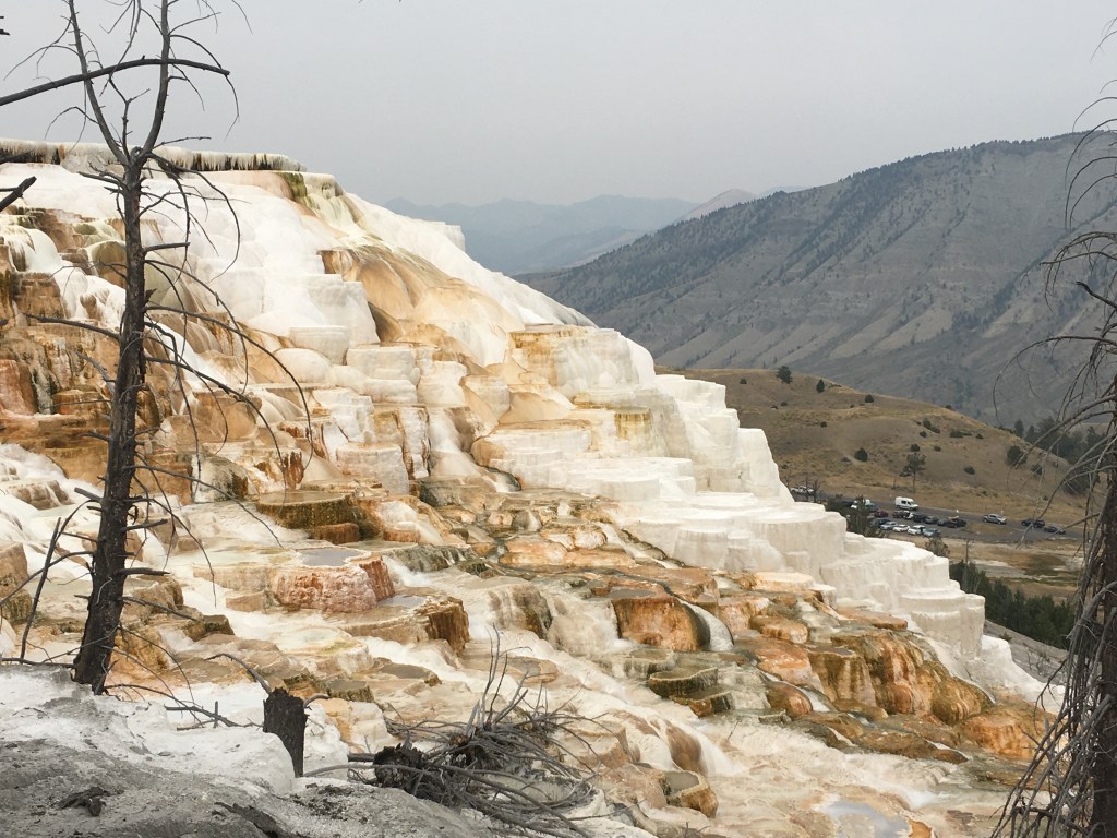 The Grand Canyon brought us the first of many waterfalls. The cauldrons were malodorous so the falls were a pure delight to all senses. We walked on the path between Uncle Tom’s Trails to Artist Point. We still had the thrill of first timers but it did portend more good things to come. The third stop was one many people told us was a must see: Mammoth Hot Springs. We climbed a lot and had the weird phenomenon of having the air get hotter as we ascended. But that’s the thermal dynamic juju going on. The landscape is otherworldly, and this area boasts to be the only area in the park where you can see the landscape change from year to year in the terraces, travertine flats, and sulphur pools. The sulphur smell permeates here, but the unbelievable scenery makes it worth enduring.
