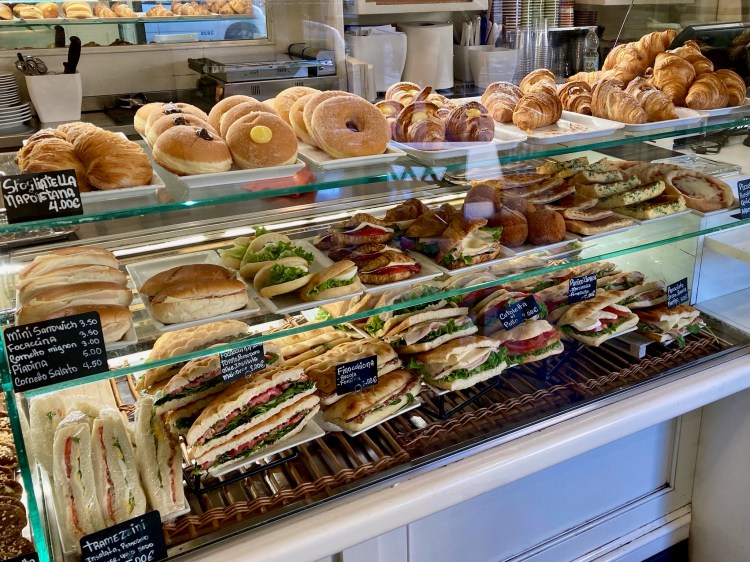 This afternoon’s aperitivo had a twist. We returned to Café Condotta for ochi di bue and cappuccinos. Waiting outside the café, a woman walked by and stopped and looked at me. We pointed at each other, in that way you do when you know you know someone but can’t remember from where. It turns out we share a common friend named Beth. All of us still live in our hometown. Karen went to school with Beth, and I know Beth from our daughters’ friendship. We chatted about what brought us to that place at that time, then took a selfie to send to Beth. Small world.