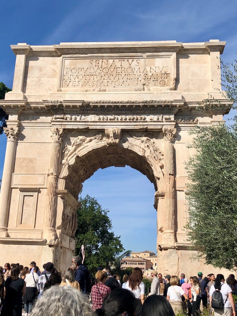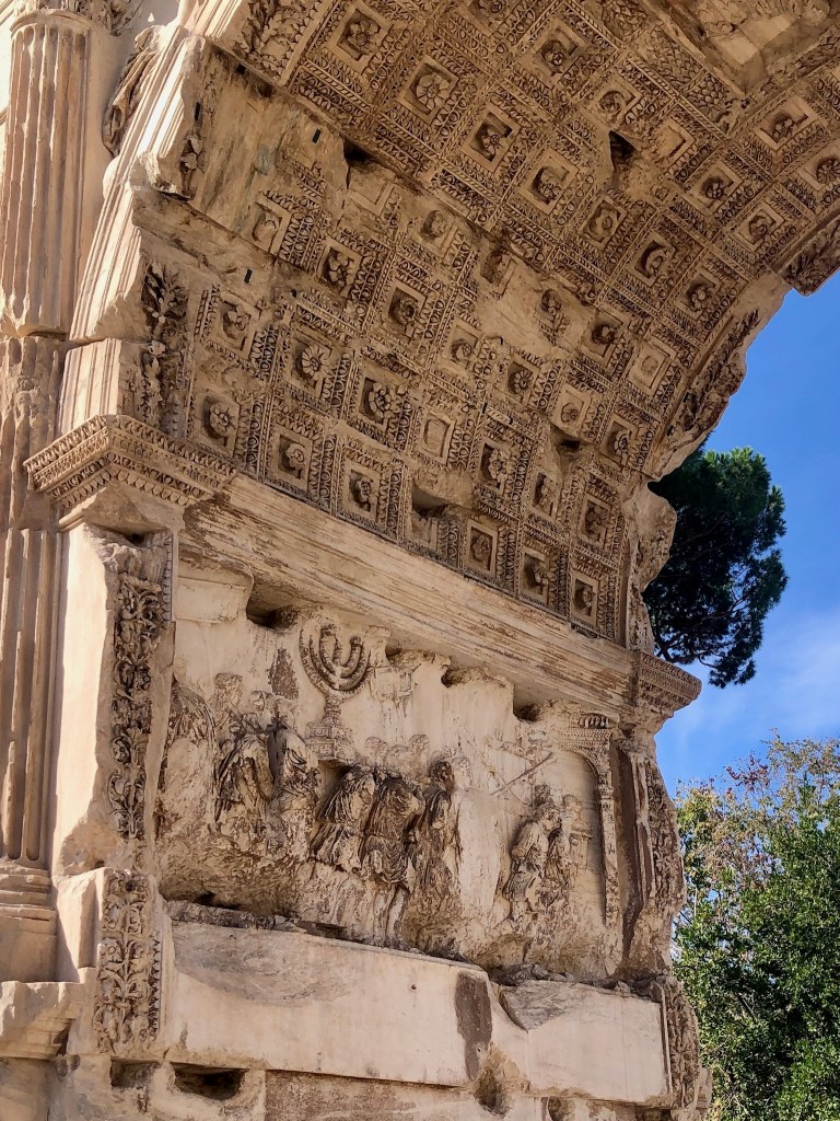 The Colosseum was fascinating, ancient and ( full of stories of which we barely scratched the surface. In its heyday, it was a mecca of entertainment for all Rome: four levels of seating for ruling class, upper class, average joes(giuseppes?), and slaves. The place was built by slaves and many of the gladiators were slaves. When the Roman Empire sacked Jerusalem in 70 AD and kicked off the Jewish diaspora, they plundered all the jewels, gold, and treasure from Solomon’s Temple (what remains is the Wailing Wall). They also took many of the citizen, some to sell and some to build the Colosseum. That bootie was sold to fund the project. In the nearby Arch of Titus, the plundering of Jerusalem is portrayed in carvings, and that arch was the model for the Arc de Triomphe in Paris.