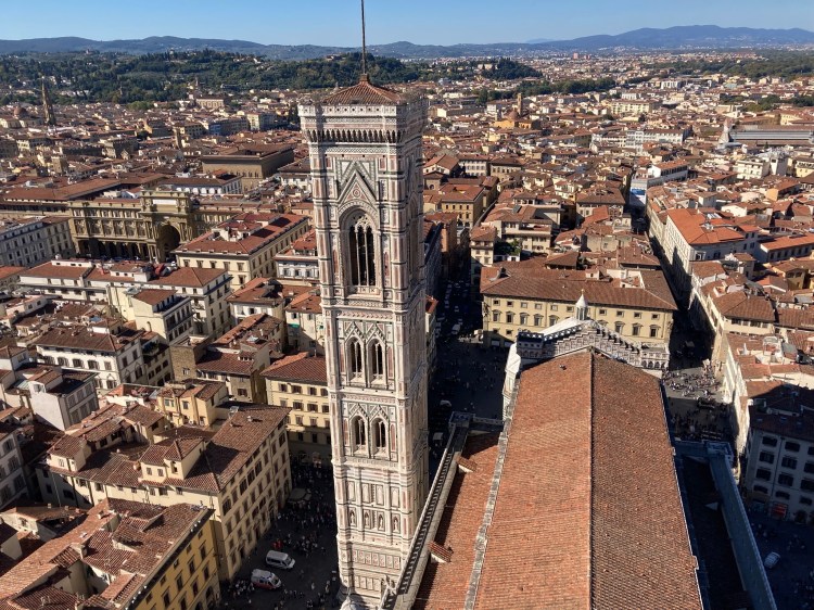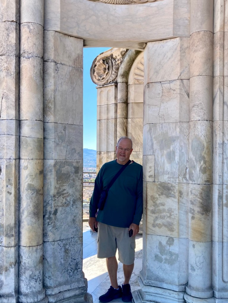 Day 8– We were on our own for breakfast because the hotel’s buffet was too pricey at 20 Euro each. We had an 11:15 appointment to climb the top of the il Duomo Cupola. We found Café Condotta, which had a variety of offerings. We split a toasted salami focaccia and almond raisin bun, and one cappuccino each. The climb was booked ahead from the Santa Maria di Fiori (which is the formal name for the church) website. We bought the Brunelleschi Pass which allowed us to climb 463 steps to the top of the dome but also gave access to the Baptistery, Giotto’s Bell Tower, Brunelleschi’s Dome, and the Opera del Duomo Museum. The nice thing about this Pass is the sites can be visited within three days of starting. The climb, however, had a specific time that was booked and was on the first day of the Pass.