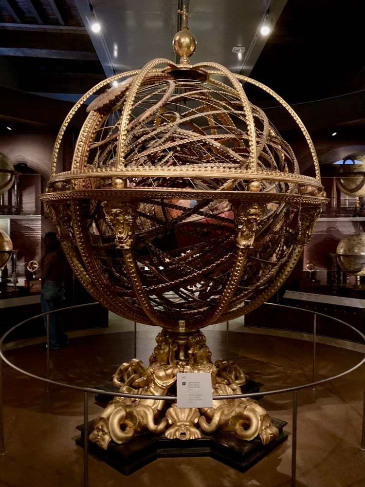 We spent our afternoon touring the Galileo Museum near the Arno River. It was less about the story of Galileo and more about the spirit of those scientific innovations that, largely funded by the Medicis, spilled out of Florence in the Renaissance era. It’s mostly scientific instruments, crude at first but becoming refined, and important in the advancement of discovery and understanding of the physical world. It’s not just the idea of these precise measuring instruments but the craftsmanship of designing and building them. It was really worthwhile; and less hectic that other museums in Florence.