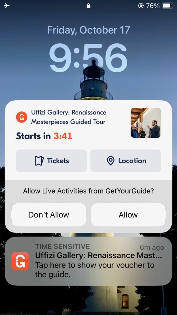 Day 9 – The airport in Florence is small and a half-hour drive from our hotel so we were forced to take a taxi. It came at 3:30 a.m., to ensure we got to the airport when it opened at 4 a.m. At 3:30 in the morning, Florence is still hoping with people celebrating “I don’t know what,” and our driver didn’t hold the convention about the half hour it takes to get to the airport. We had a harrowing ride, using gas stations as shortcuts. The “30-minute drive” took 18 minutes; we got to wait outside for 12 minutes for the airport to open and get our heart rates back to normal.