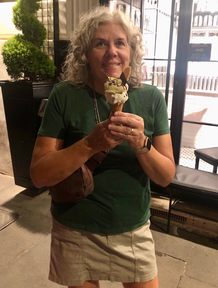 We saved room for dessert and searched for gelato, because Italy, and found in walking distance the best gelato we ever had at Come il Latte Gelateria (translated as Just Like Milk). This place was a gem, seemingly delivered there by divine intervention. In our pre-Italy research, we learned the best gelato is not found in heaping trays of brightly colored product. That is probably okay but not traditional and not as good. We packed food snobbery (we don’t leave home without it) on this trip and certainly intended to use it. Come il Latte gelato was properly stored in covered stainless steel bins and avoided artificial bright food colors. What it did provide was a cone, layered inside with your choice of milk or white chocolate; delicious, creamy gelato; and a wafer dipped in milk or white chocolate placed on top. In addition, whipped cream was offered on top. It was a great way to end our first day in Italy.