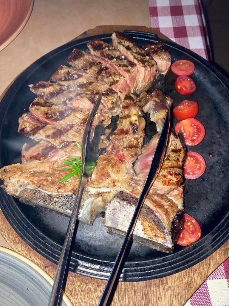 Our steak was a 1.3-kilogram T-bone done medium, which was the highest doneness we could get. While that was prepared, we enjoyed the pecorino pasta show (like tableside guacamole at a Mexican restaurant but with fire and cheese).