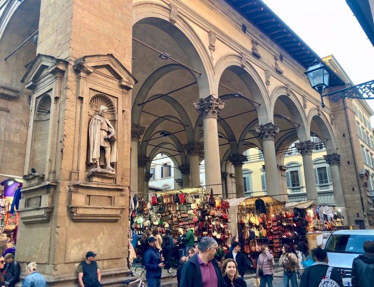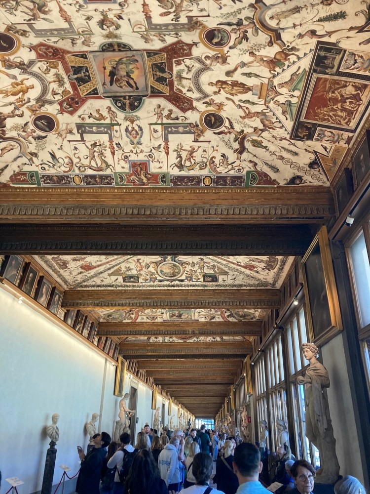 Room by room, Rachel compared Medieval art to Renaissance art so we could see hundreds of years of change before our eyes. She explained the Medicis and their reign of the city-state. Important to the family was the Vasari Corridor, built in the 1560s, an elevated corridor that connects the offices to the Palazzo Pitti (Pitti Palace), that goes across the Arno via the Ponte Vecchio. Why mingle with the people on the streets, especially if you are the powerful Cosimo I de Medici, whose predecessor was assassinated and who consolidated a lot of power and control? You might risk your life just to go to the office.