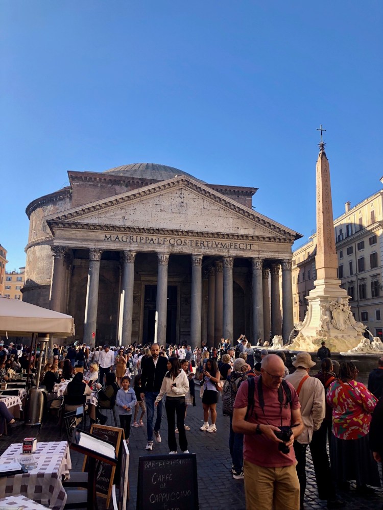 Day 3 – The third full day, and our last in Rome, was a freebie, no scheduled tours. We walked over to the Pantheon, which unlike the Colosseum was not in ruins but fully intact. It looms over the piazza and surrounding neighborhood. Originally built as a temple to Roman gods in 25 B.C., it’s been a Catholic Church since 609 A.D. when the Catholicism became the religion of the Roman state. As we toured, people were gathering for a Mass. The Pantheon has a huge dome which remains the largest unreinforced concrete dome in the world. It’s one of many buildings in Italy where you wonder “how’d they build that?”