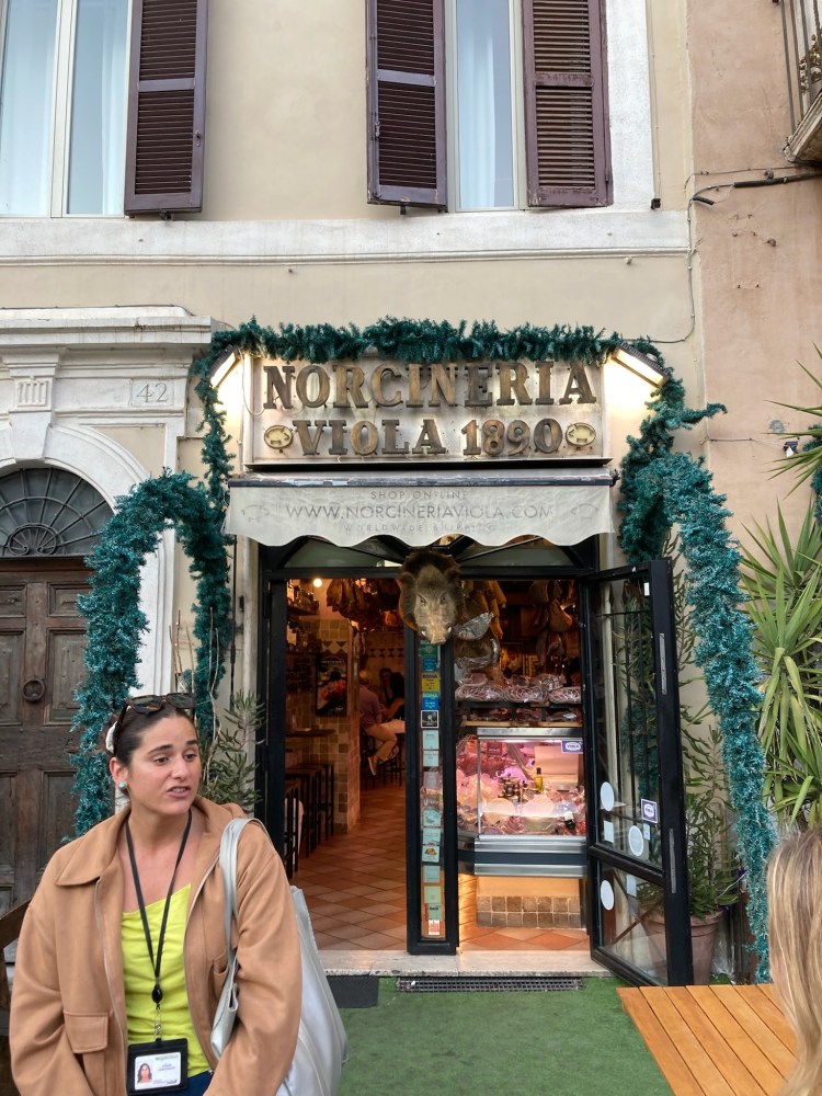 We learned about Bruno and other interesting parts of Rome on the food tour, and even learned how a proper Roman drinks the water from the city’s many water spigots. Our first stop was in the Campo di Fiori piazza at Norcineria Viola, which offered the best bites a cured, spiced pig can offer. We had various Roman salamis and wine, sold at the store.